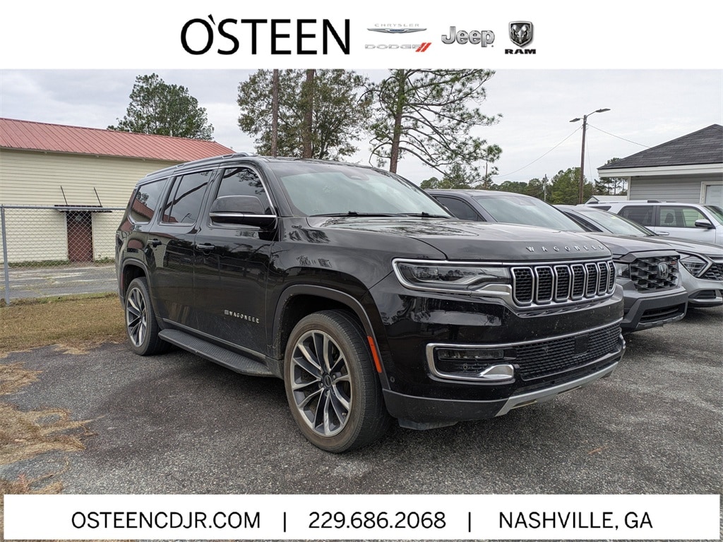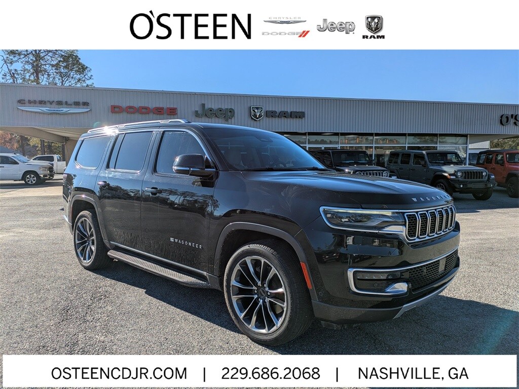 2022 Jeep Wagoneer Series II CLEAN CARFAX, NO ACCIDENTS, ONE OWNER, • "Pre-Owned with Peace of Mind â€" Only at O’Steen.", Wagoneer Series II, 5.7L V8, 4WD, Diamond Black Crystal Pearlcoat, Black Leather, 10 Speakers, 3 Panel Sunroof, 3.21 Rear Axle Ratio, 3rd row seats: bench, 4-Wheel Disc Brakes, ABS brakes, Adjustable pedals, Adjustable Roof Rail Crossbars, Air Conditioning, AM/FM radio: SiriusXM with 360L, Audio memory, Auto-leveling suspension, Automatic temperature control, Cargo Cover, Delay-off headlights, Four wheel independent suspension, Front Bucket Seats, Front Center Armrest w/Storage, Front dual zone A/C, Front fog lights, Garage door transmitter, Genuine wood console insert, Genuine wood dashboard insert, Genuine wood door panel insert, Heated front seats, Heated steering wheel, Leather Trimmed Bucket Seats, Memory seat, Navigation System, Panic alarm, Passenger door bin, Passenger seat mounted armrest, Passenger vanity mirror, Pedal memory, Power driver seat, Power passenger seat, Power steering, Power windows, Premium Group I (DISC), Quick Order Package 22J, Radio data system, Radio: Uconnect 5 Nav w/10.1" Display, Rain sensing wipers, Rear air conditioning, Rear dual zone A/C, Rear seat center armrest, Rear window defroster, Rear window wiper, Reclining 3rd row seat, Remote keyless entry, Reversible Carpet/Vinyl Cargo Mat, Security system, Speed control, Split folding rear seat, Steering wheel memory, Steering wheel mounted audio controls, Trip computer, Ventilated front seats, Voltmeter, Wheels: 22" x 9.0" Premium 3 Aluminum (DISC).
